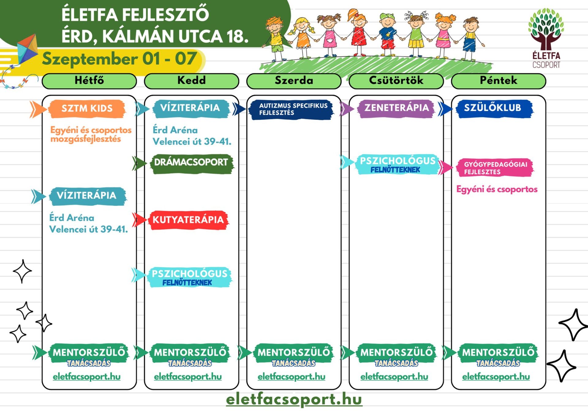 Elérkezett az új tanév kezdete, és nagy örömmel osztjuk meg veletek, hogy az Életfa Fejlesztőházban ismét számos szakmailag megalapozott fejlesztési lehetőség várja a gyermekeket. Mostantól heti naptárban követhetitek, milyen terápiák és foglalkozások érhetők el nálunk – így könnyebben tudtok tervezni és választani az igényeknek megfelelően.